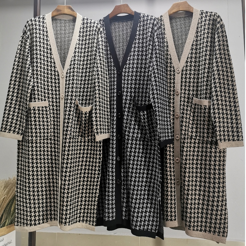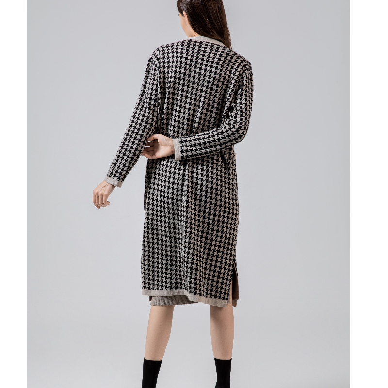 Fashionable avslappnade joker qianbirdcheck ull stickad långkofta päls 69.069#